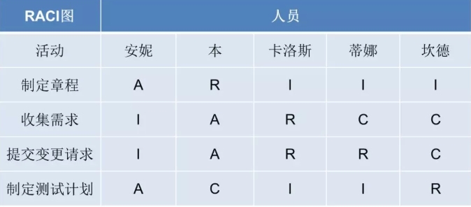 責任分配矩陣有不同的形式,上圖這個是用符號表示的,此外,還有我們熟悉的RACI責任分配矩陣。