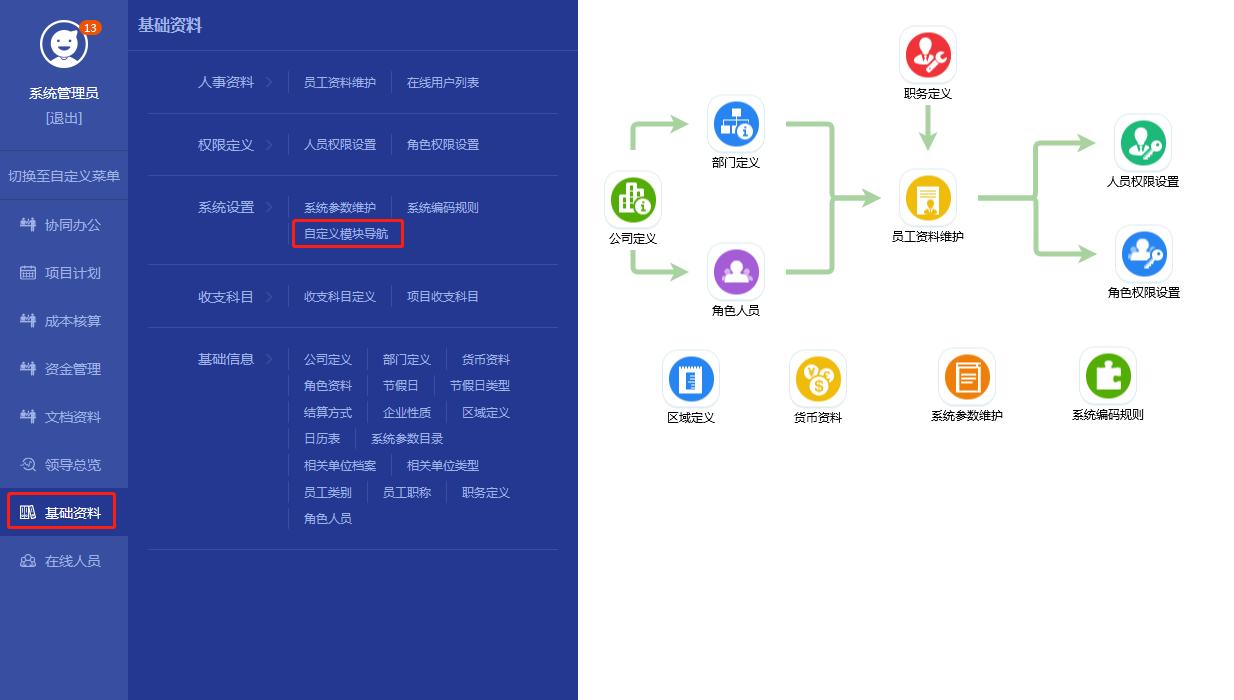用戶(hù)可以在“基礎(chǔ)資料——系統(tǒng)設(shè)置——自定義模塊導(dǎo)航”菜單中,根據(jù)公司的業(yè)務(wù),設(shè)計(jì)模塊業(yè)務(wù)導(dǎo)航圖
