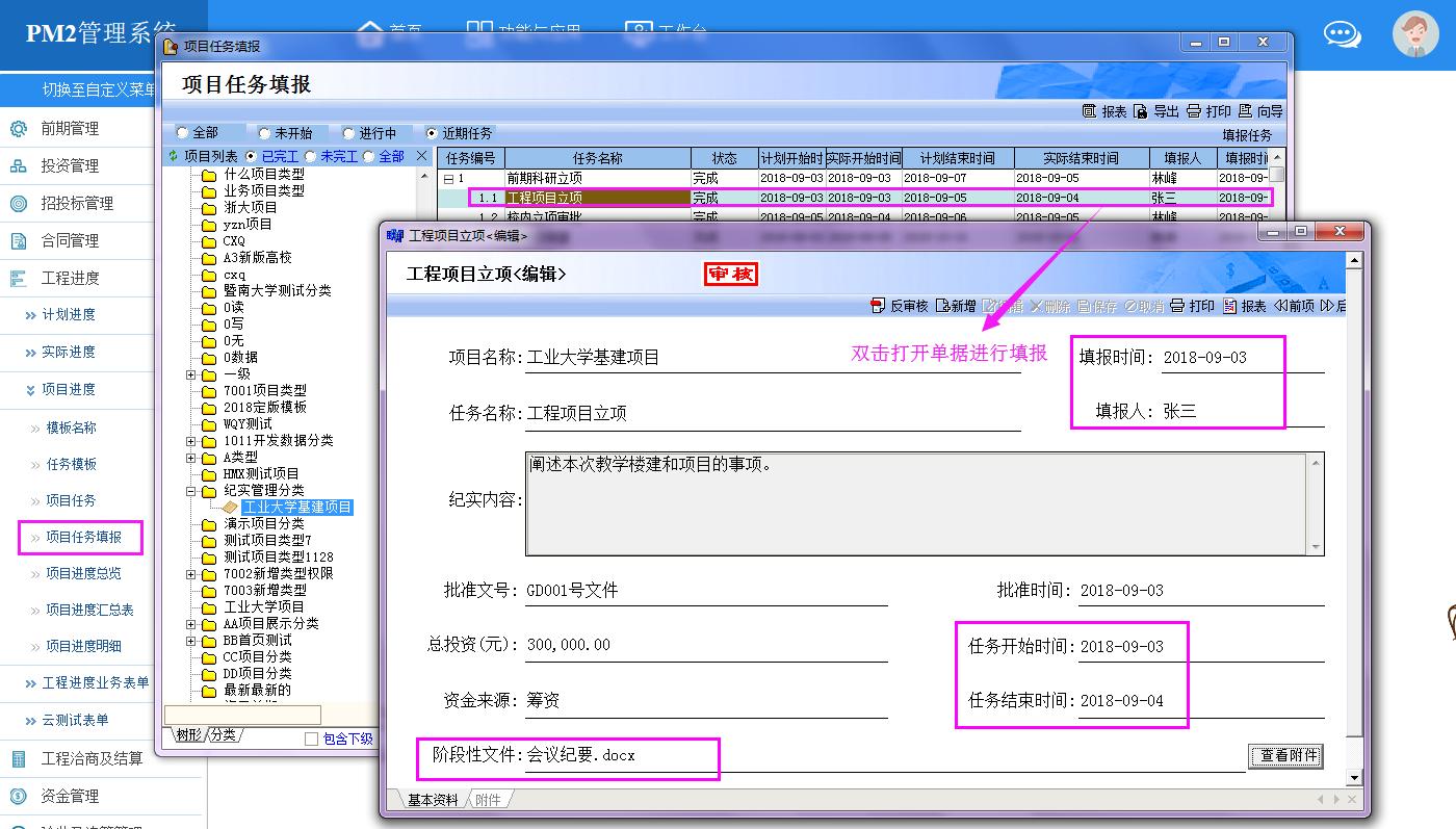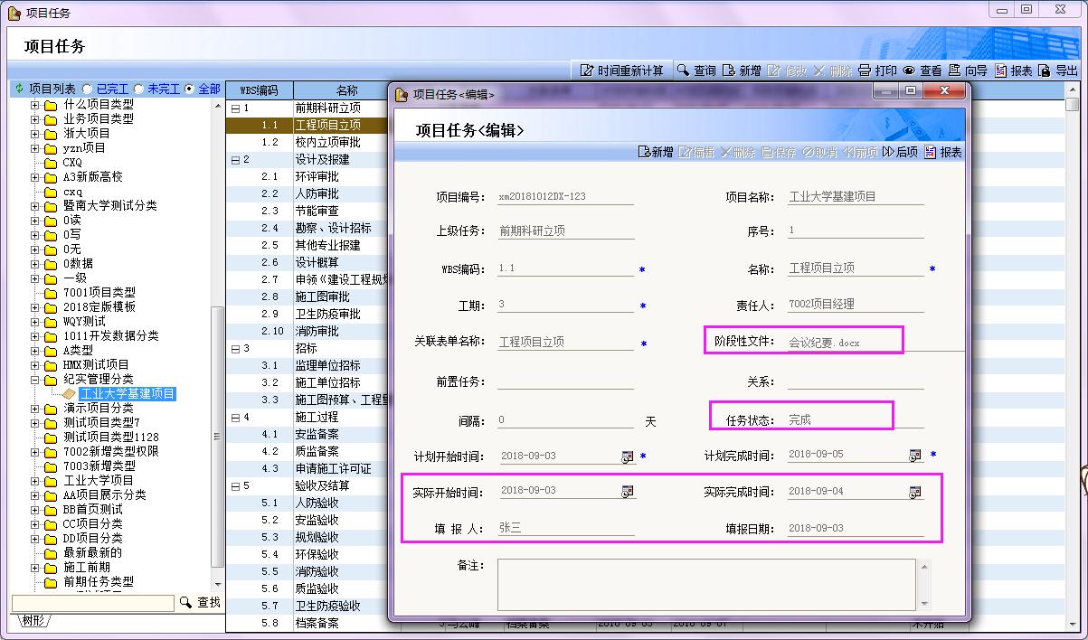 3. 任務(wù)填報后,可以將開始、完成時間、填報人、階段性文件反填到任務(wù)計劃中方便查看;