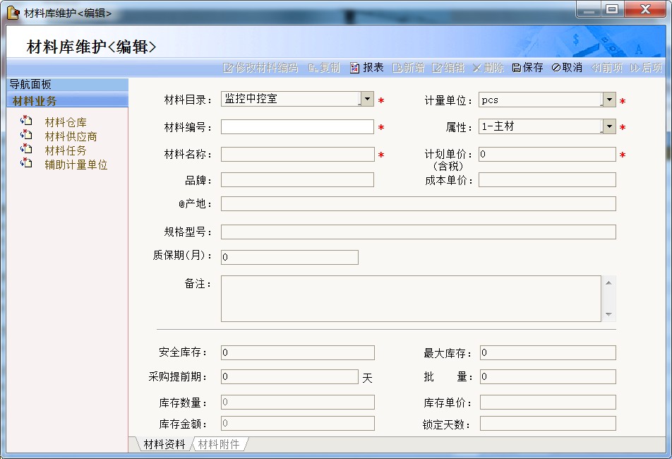 操作:打開【材料庫維護】界面,左側(cè)選擇材料目錄,單擊“新增”按鈕,系統(tǒng)彈出材料庫維護編輯界面,錄入材料編號、材料名稱、計量單位、屬性、計劃單價、規(guī)格、產(chǎn)地等信息后保存。