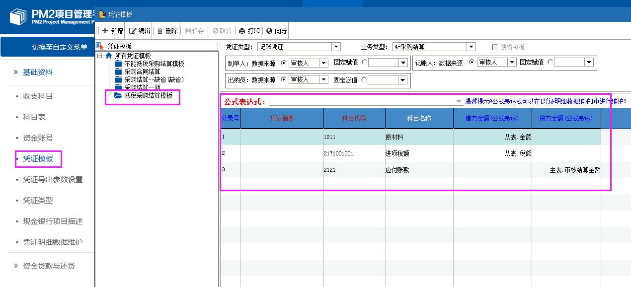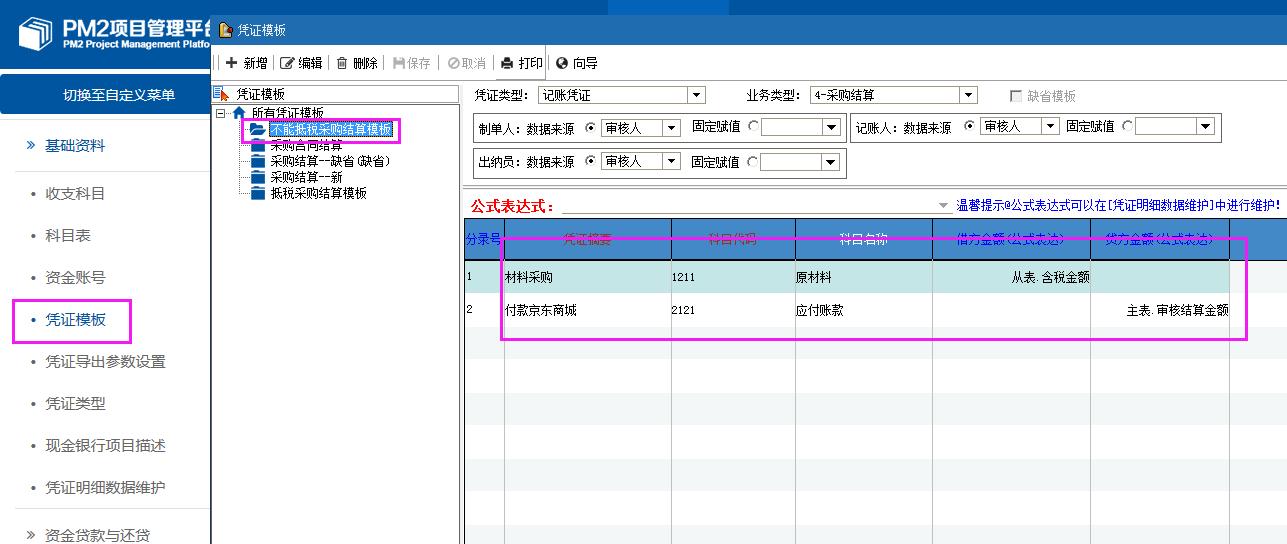 2.2)、憑證模板的明細(xì)設(shè)置:在邦永PM2軟件中的各項業(yè)務(wù)中,采購合同結(jié)算與借款報銷兩類業(yè)務(wù)生成憑證是最為復(fù)雜的,下面以這兩類業(yè)務(wù)的部分情況