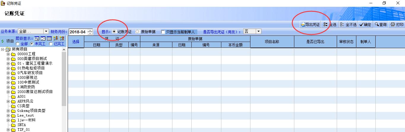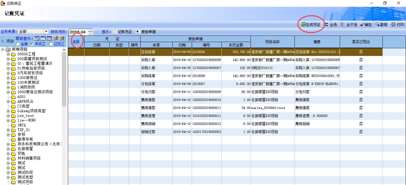 打開【記賬憑證】界面,左側(cè)選擇項目,右側(cè)列出該項目的原始單據(jù)。具體操作步驟如下: