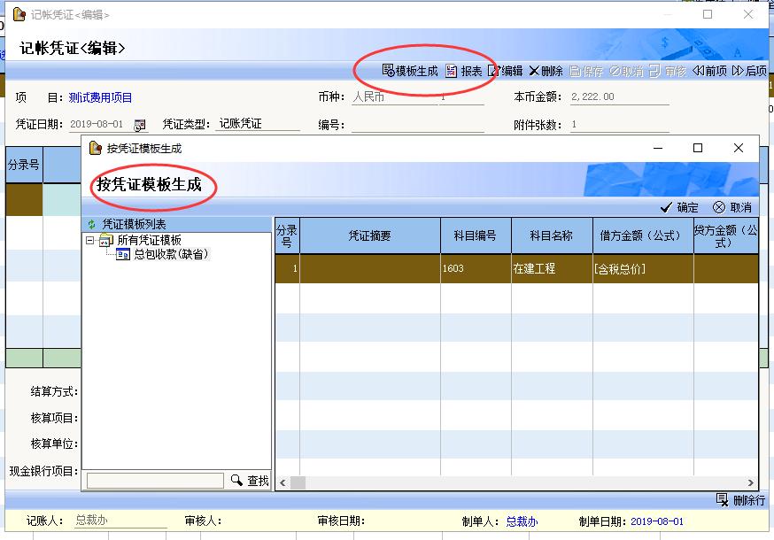 ü 用其他憑證模板自動生成:雙擊此類原始業(yè)務(wù)單據(jù),在下圖的界面中點擊“模板生成”后,在彈出的界面中選擇適用的憑證模板自動生成憑證。