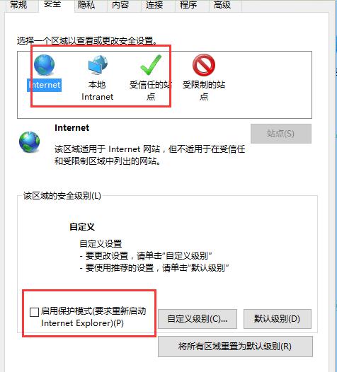 解决�Ҏ(gu��)���Q�打开IE选项�Q�在取消IE保护模式�Q�请看下图: