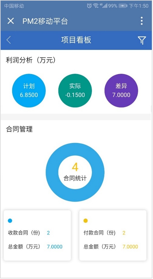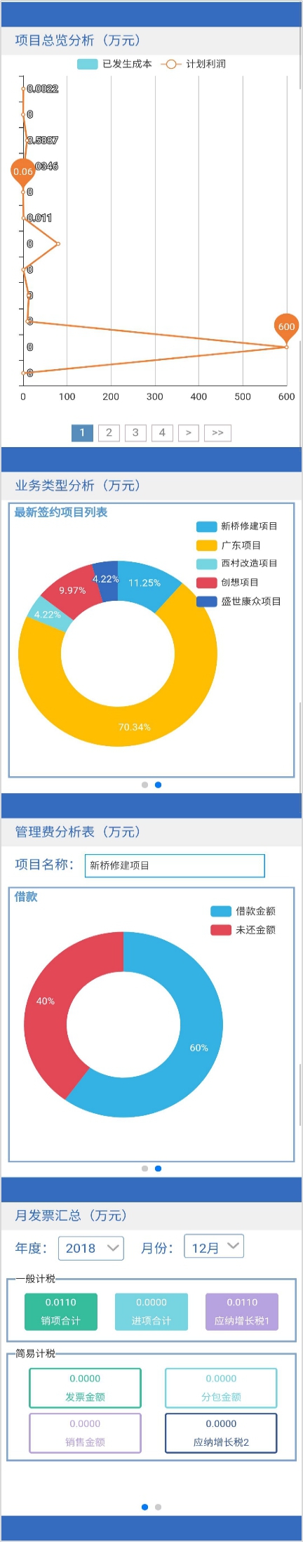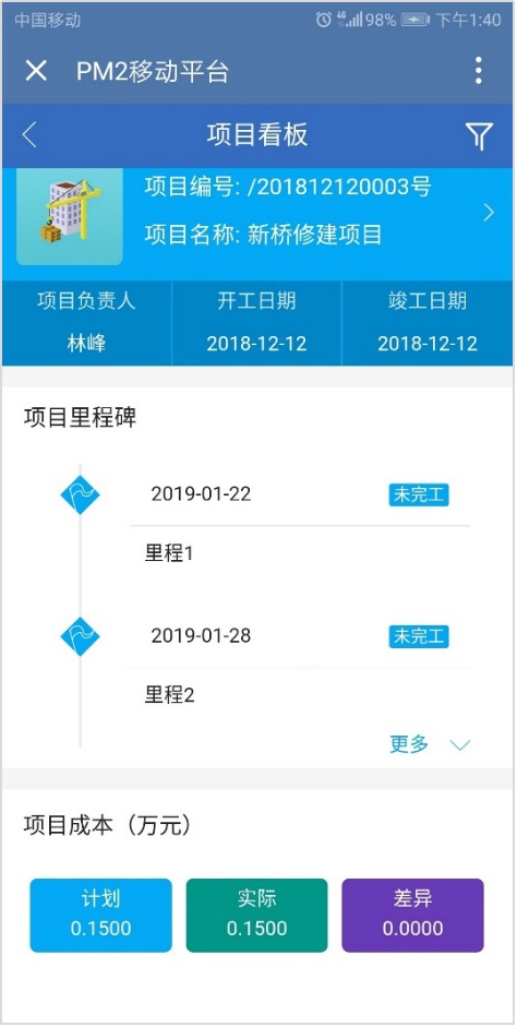 可以�q�入查看该项目的负责人,开工竣工日期、里�E�碑、项目成本、利润分析,相关合同金额�Q�收支统计和施工日志�{�信息,更全面地了解该项目的�q�展情况�?/p>