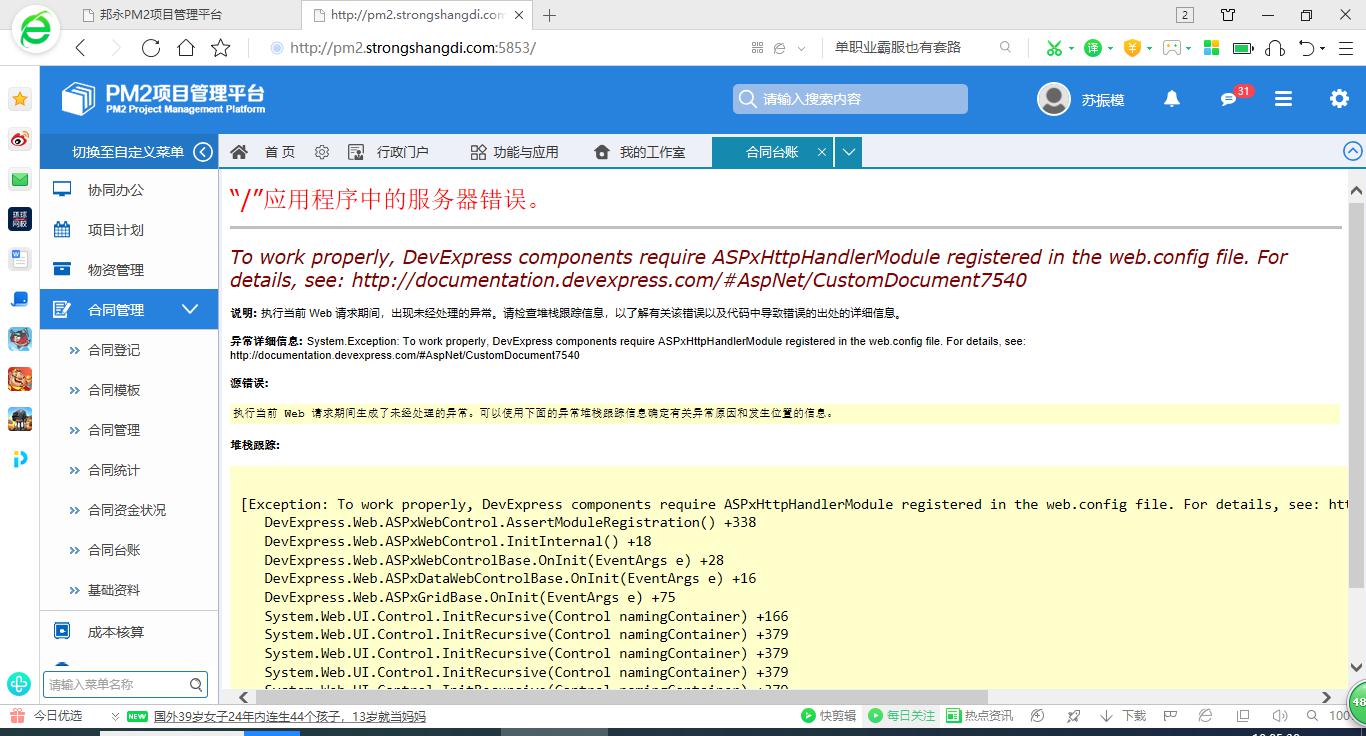 问题描述�Q�打开合同台�̎�Ӟ���pȝ��报DerExpress components require AspxHttHandlerModule错误�?/p>